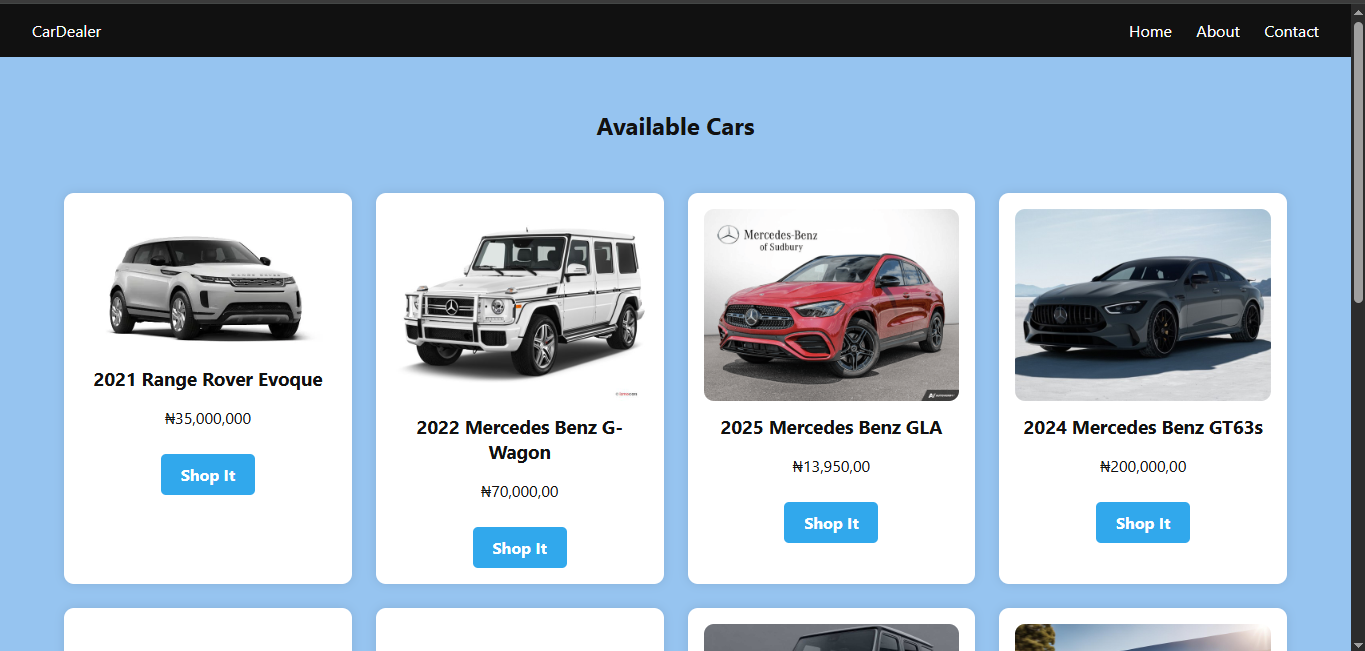 đźš— Car Dealer Website This is a simple and attractive car dealership website built using HTML, CSS, and JavaScript. The website displays available cars in a grid layout and includes WhatsApp integration for easy inquiries.